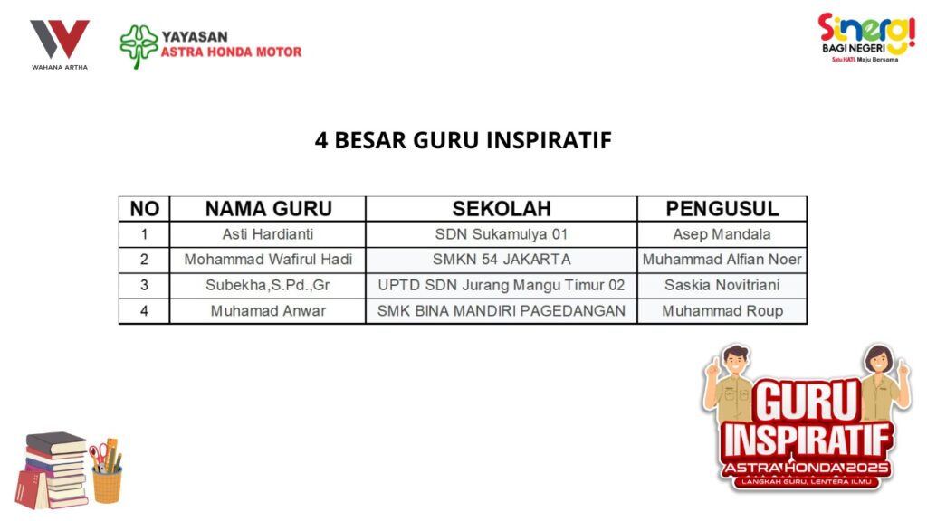 Dari proses penilaian yang intensif, empat guru terbaik berhasil terpilih untuk mewakili WMS di ajang Guru Inspiratif Astra Honda 2025 tingkat Nasional. Mereka akan bersaing dengan perwakilan Main Dealer Honda dari seluruh Indonesia.